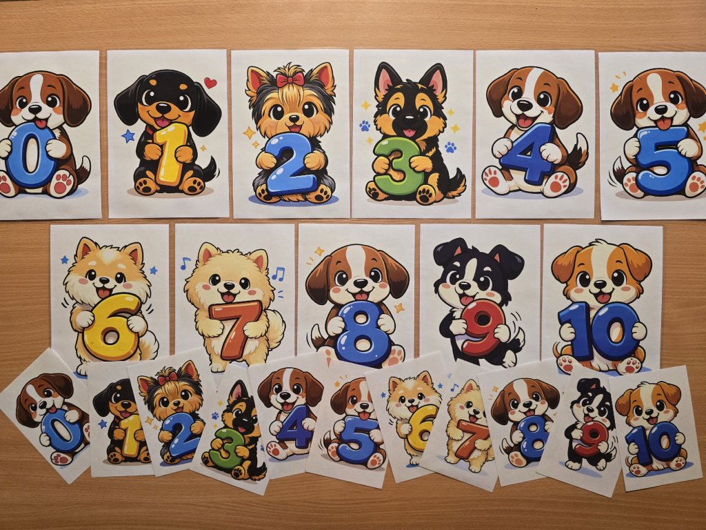 Děti sedí v kruhu nebo u tabule. Učitel rozloží kartičky s pejsky a čísly. Děti společně skládají číselnou řadu od nejmenšího čísla k největšímu a „vedou pejska na procházku“. Po sestavení řady učitel pokládá otázky zaměřené na orientaci v číselné řadě (první, poslední, hned před, hned za). - Práce ve dvojici – „Pejsci si pomáhají“