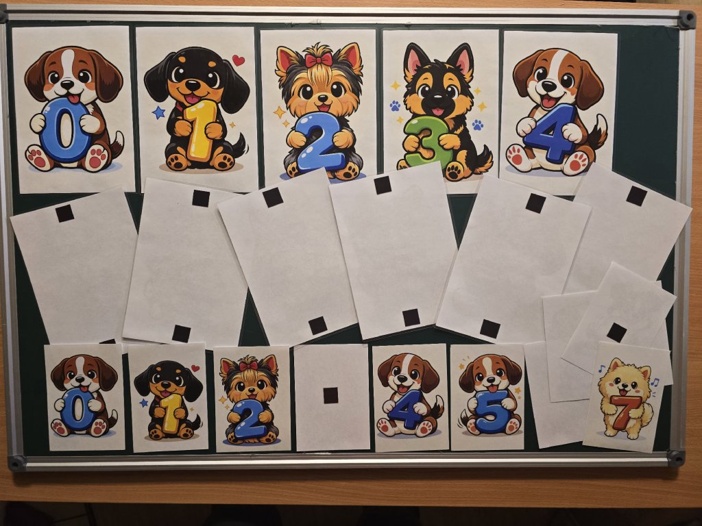 Děti sedí v kruhu nebo u tabule. Učitel rozloží kartičky s pejsky a čísly. Děti společně skládají číselnou řadu od nejmenšího čísla k největšímu a „vedou pejska na procházku“. Po sestavení řady učitel pokládá otázky zaměřené na orientaci v číselné řadě (první, poslední, hned před, hned za). - Práce ve dvojici – „Pejsci si pomáhají“