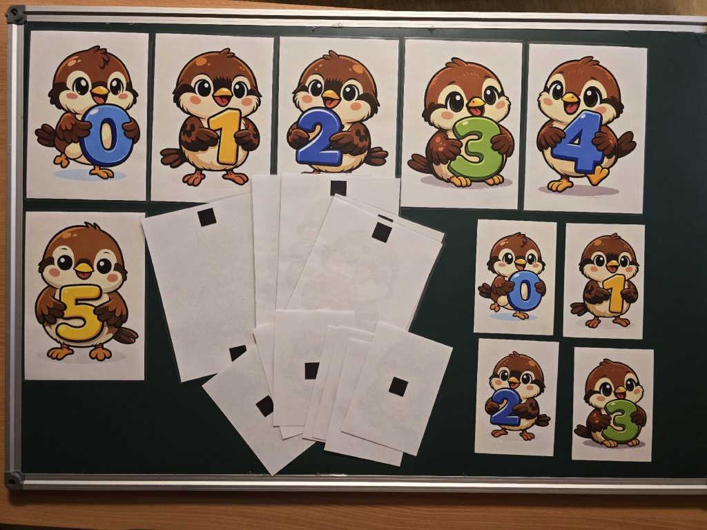 Děti pracují ve dvojicích. Jedno dítě skládá číselnou řadu z ptáčků, druhé dítě kontroluje správné pořadí a odpovídá na otázky učitele (např. „Který ptáček je hned před pětkou?“). Poté si role vymění. Aktivita podporuje spolupráci, komunikaci a vzájemnou kontrolu. - Samostatná činnost – „Najdi ptáčka“