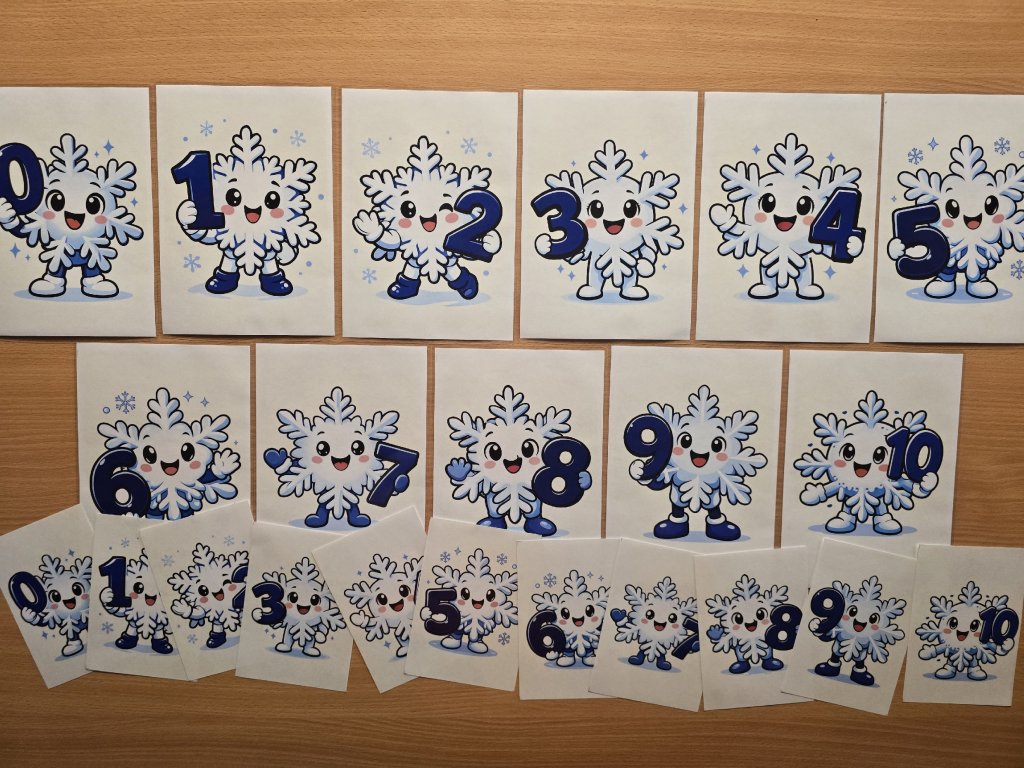 Děti sedí v kruhu nebo u tabule. Učitel rozloží kartičky s vločkami a čísly. Děti společně skládají vločky do číselné řady od nejmenšího čísla k největšímu, jako by padaly sněhové vločky. Po sestavení řady učitel pokládá otázky zaměřené na orientaci v číselné řadě (první, poslední, hned před, hned za). - Práce ve dvojici – „Zimní vločky“