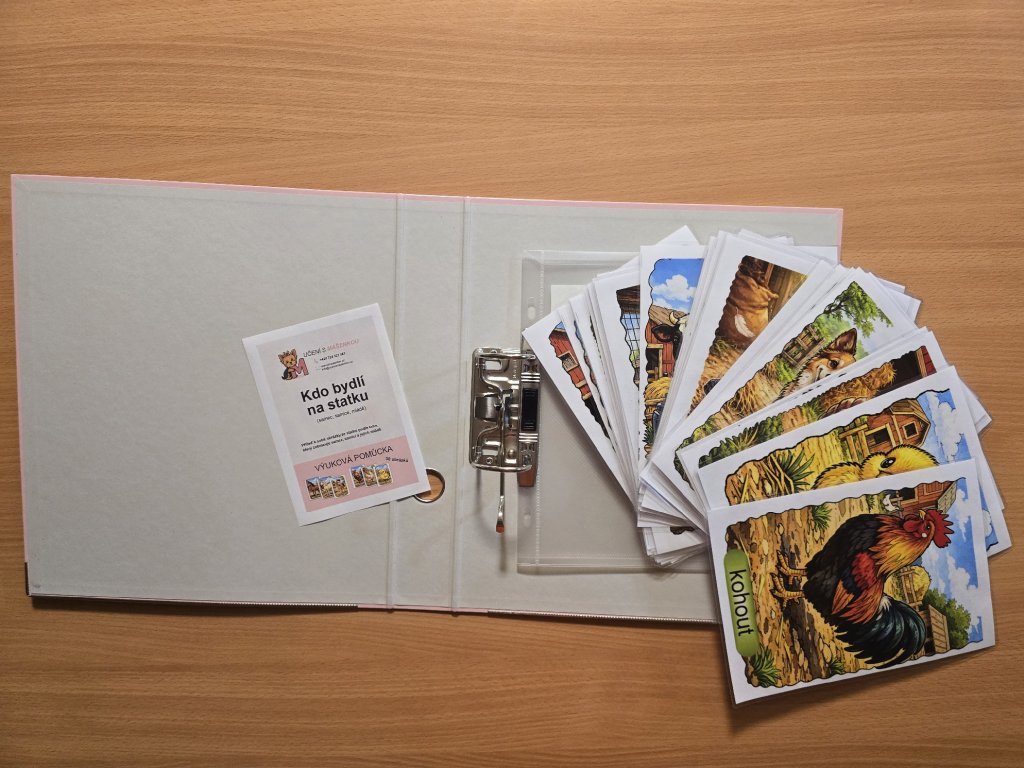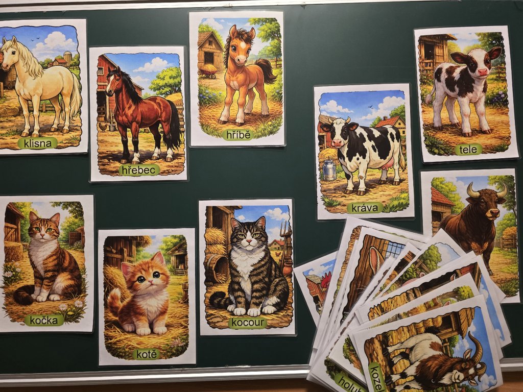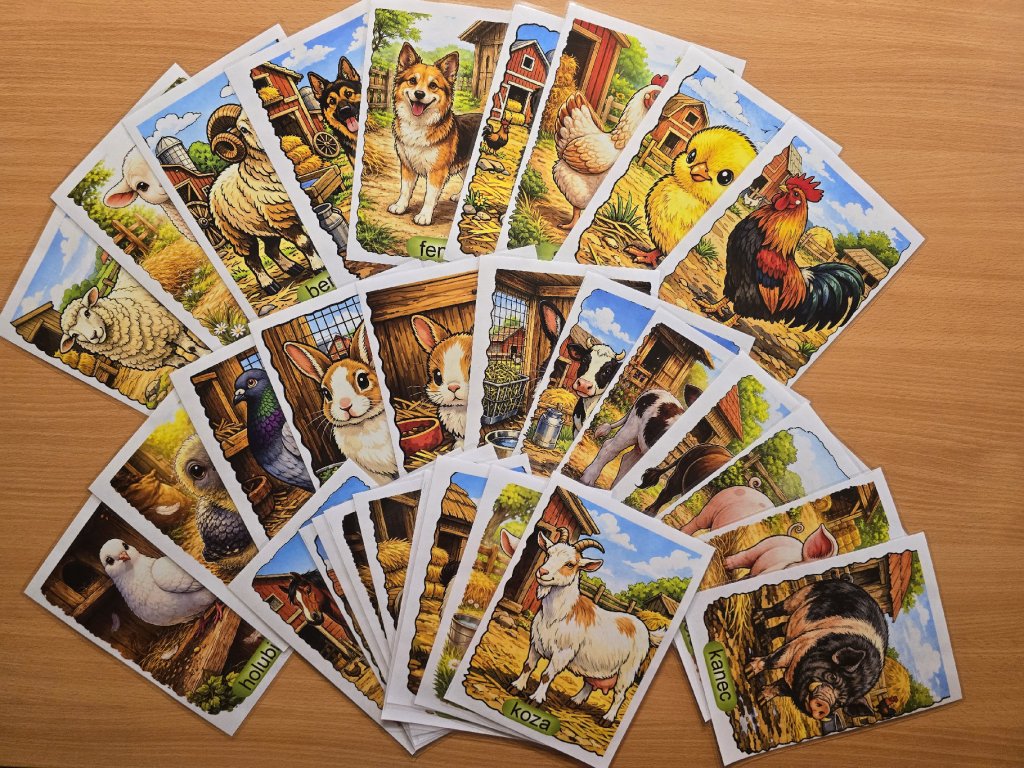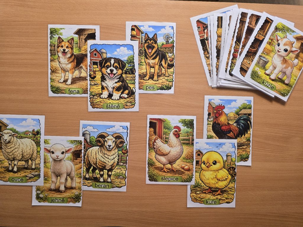 Dítě samostatně třídí obrázky hospodářských zvířat do správných trojic. Po dokončení si každou trojici nahlas pojmenuje (např. býk – kráva – tele) a zkontroluje správnost přiřazení. Učitel poskytuje podporu, zpětnou vazbu a slovní ocenění.