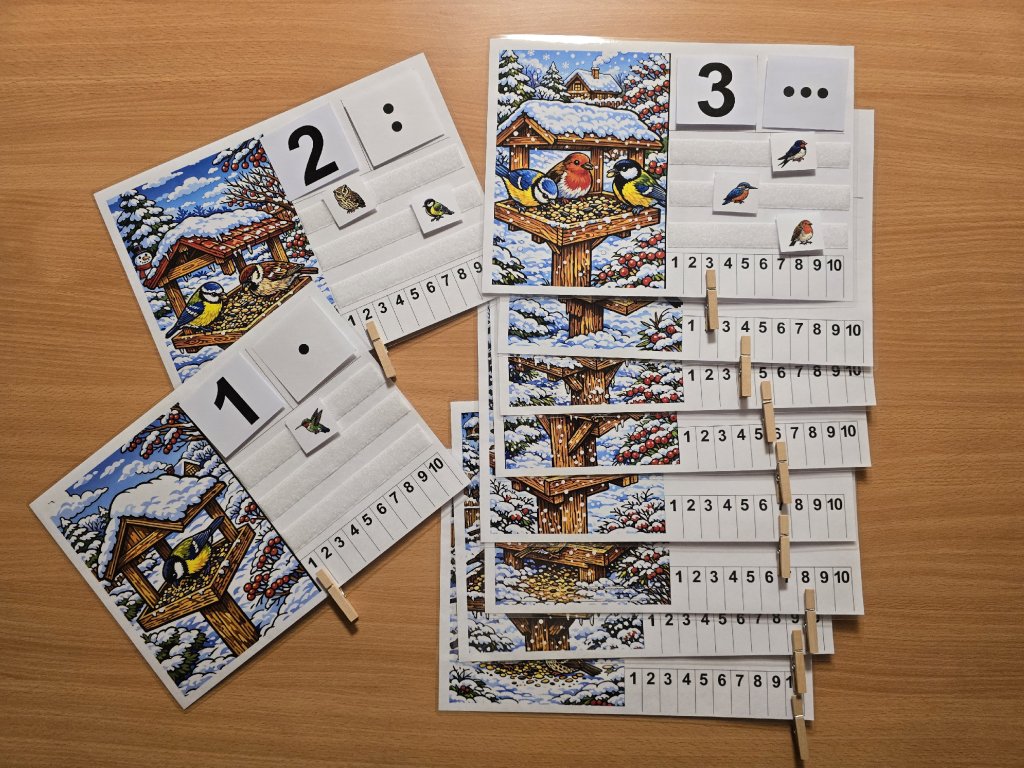 Děti sedí v kruhu. Uprostřed jsou podložky s obrázkem zimního krmítka. Učitel vybere jednu podložku a společně s dětmi pojmenují číslo. Děti ke krmítku přiřazují správné číslo, kartičku s tečkami, kolíček a odpovídající počet malých obrázků ptáčků. Vše společně kontrolují a nahlas počítají.