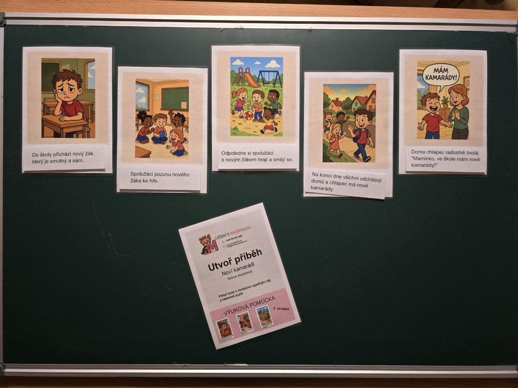 Úkolem dítěte je přiřadit texty k obrázkům vyjadřujícím děj, seřadit je do správné posloupnosti a následně příběh popsat vlastními slovy. Dítě pracuje s obrazovým a textovým materiálem a vytváří ucelený příběh ze školního prostředí. Úkol je zaměřen na rozvoj jazykových, kognitivních a sociálně-emočních dovedností dítěte prostřednictvím situace blízké jeho vlastní zkušenosti. Dítě se učí chápat dějovou posloupnost, vyjadřovat vlastními slovy prožitky postav a pojmenovávat emoce. Aktivita podporuje empatii, toleranci a pozitivní sociální chování, zejména v oblasti přijímání nových spolužáků a budování přátelských vztahů.