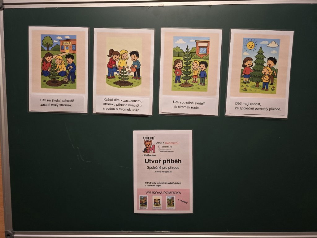Úkolem dítěte je přiřadit texty k obrázkům vyjadřujícím děj, seřadit je do správné posloupnosti a následně příběh popsat vlastními slovy. Dítě pracuje s obrazovým a textovým materiálem a vytváří ucelený příběh se zaměřením na spolupráci a péči o přírodu. Úkol je zaměřen na rozvoj jazykových, kognitivních a sociálně-emočních dovedností dítěte prostřednictvím smysluplné činnosti spojené s ochranou přírody. Dítě se učí chápat časovou posloupnost děje, vyjadřovat vlastními slovy prožitky postav a pojmenovávat emoce spojené se spoluprací a společným úspěchem. Aktivita podporuje environmentální výchovu, odpovědnost a pozitivní vztah k přírodě.