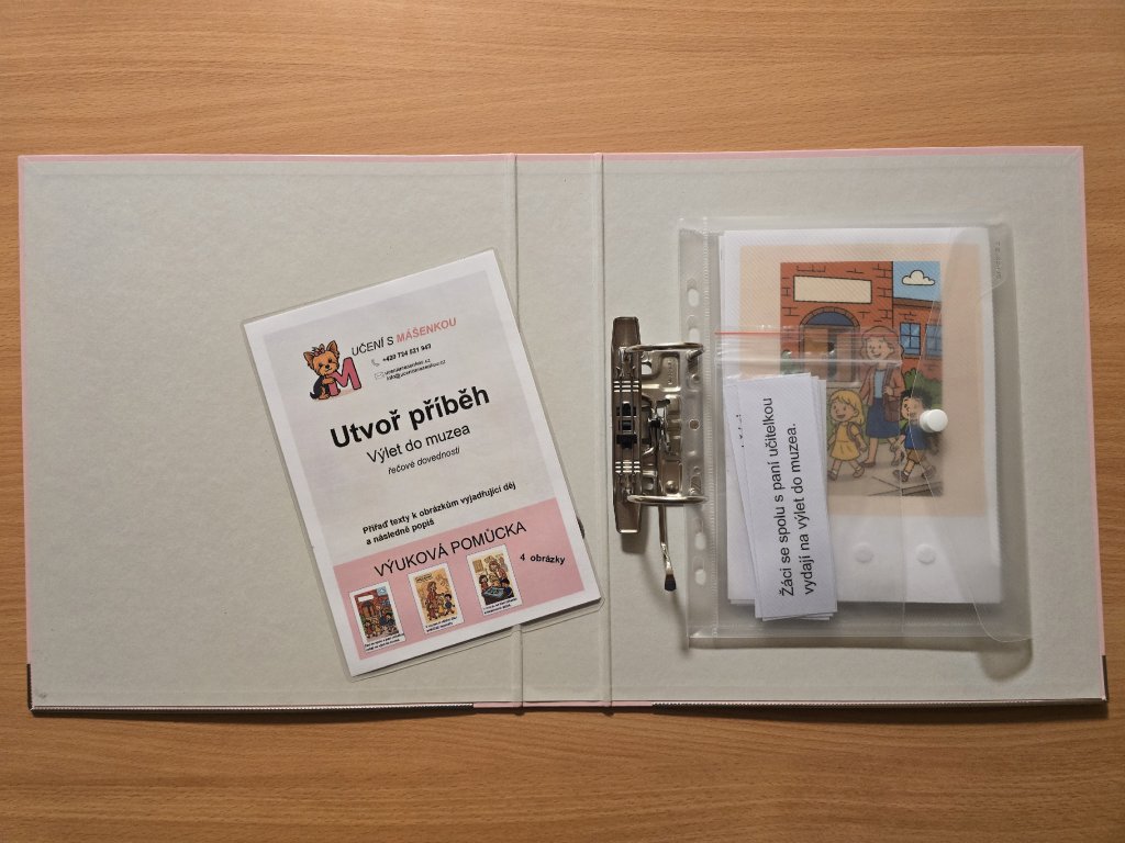 Úkolem dítěte je přiřadit texty k obrázkům vyjadřujícím děj, seřadit je do správné posloupnosti a následně příběh popsat vlastními slovy. Dítě pracuje s obrazovým a textovým materiálem a vytváří ucelený příběh ze školního prostředí. Úkol je zaměřen na rozvoj jazykových, kognitivních a sociálně-emočních dovedností dítěte prostřednictvím zážitkové situace mimo běžné školní prostředí. Dítě se učí chápat časovou posloupnost děje, vyjadřovat vlastními slovy své dojmy a pojmenovávat emoce spojené s objevováním nových míst a činností. Aktivita podporuje pozitivní vztah ke škole, kultuře a vzdělávání a rozvíjí otevřenost k novým zkušenostem.