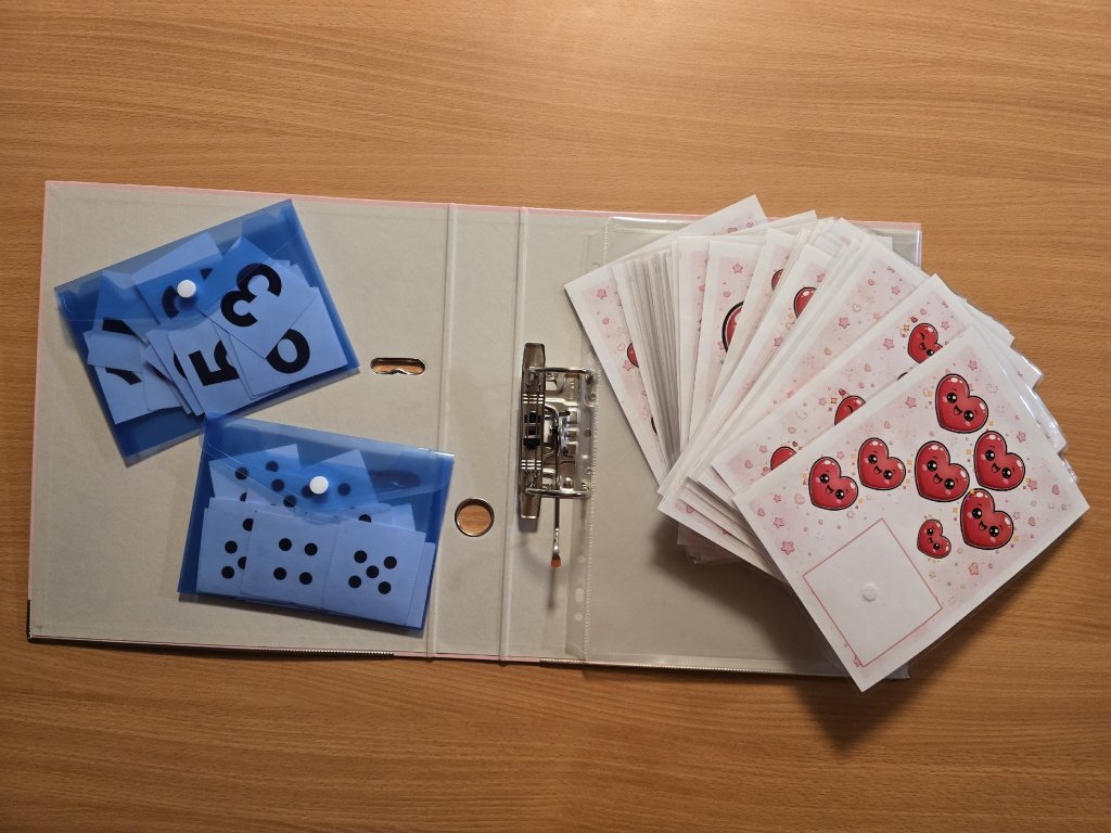 Dítě si vybere podložku se srdíčky, srdíčka spočítá a položí k nim správné číslo. Po dokončení si počet ještě jednou zkontroluje. Učitel dítěti poskytuje podporu a pochvalu.