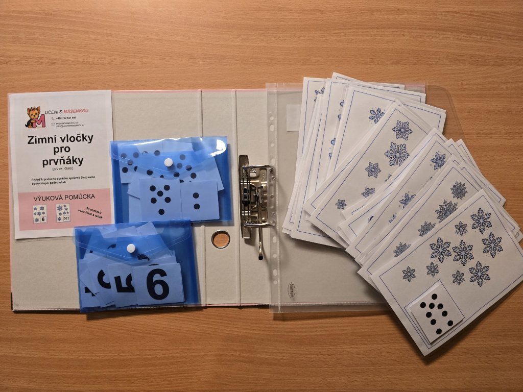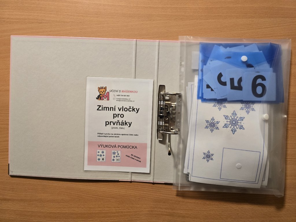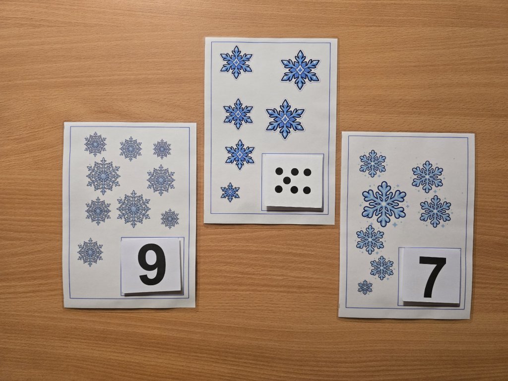 Didaktická pomůcka je zaměřena na rozvoj předmatematických dovedností. Děti pracují s podložkami se zimními motivy, na kterých počítají vločky a přiřazují k nim odpovídající číslo nebo odpovídající počet teček. Aktivita podporuje názornost, samostatnou práci a propojení čísla s konkrétním množstvím.