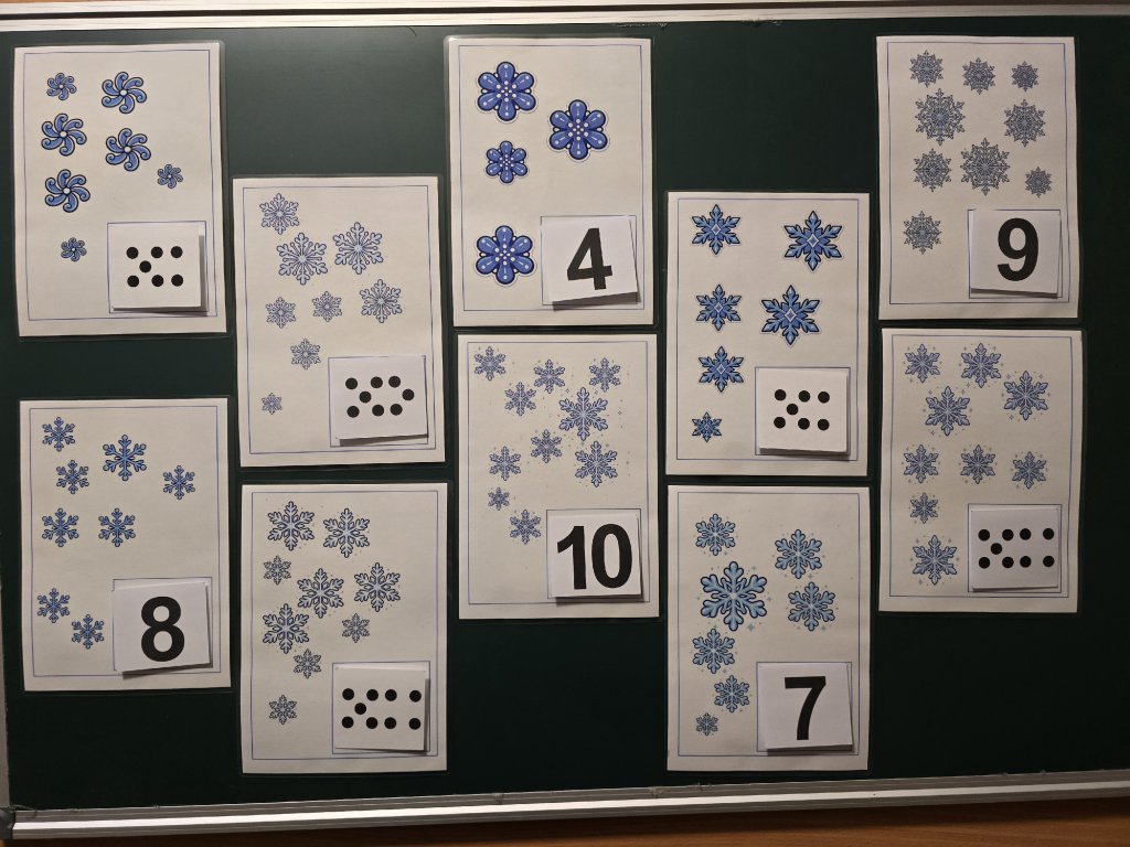 Děti sedí v kruhu. Uprostřed jsou podložky s různým počtem zimních vloček (1–10). Učitel vybere jednu podložku, děti společně vločky spočítají a vyberou správné číslo, které položí na podložku. - Práce ve dvojici – „Spočítej vločky“